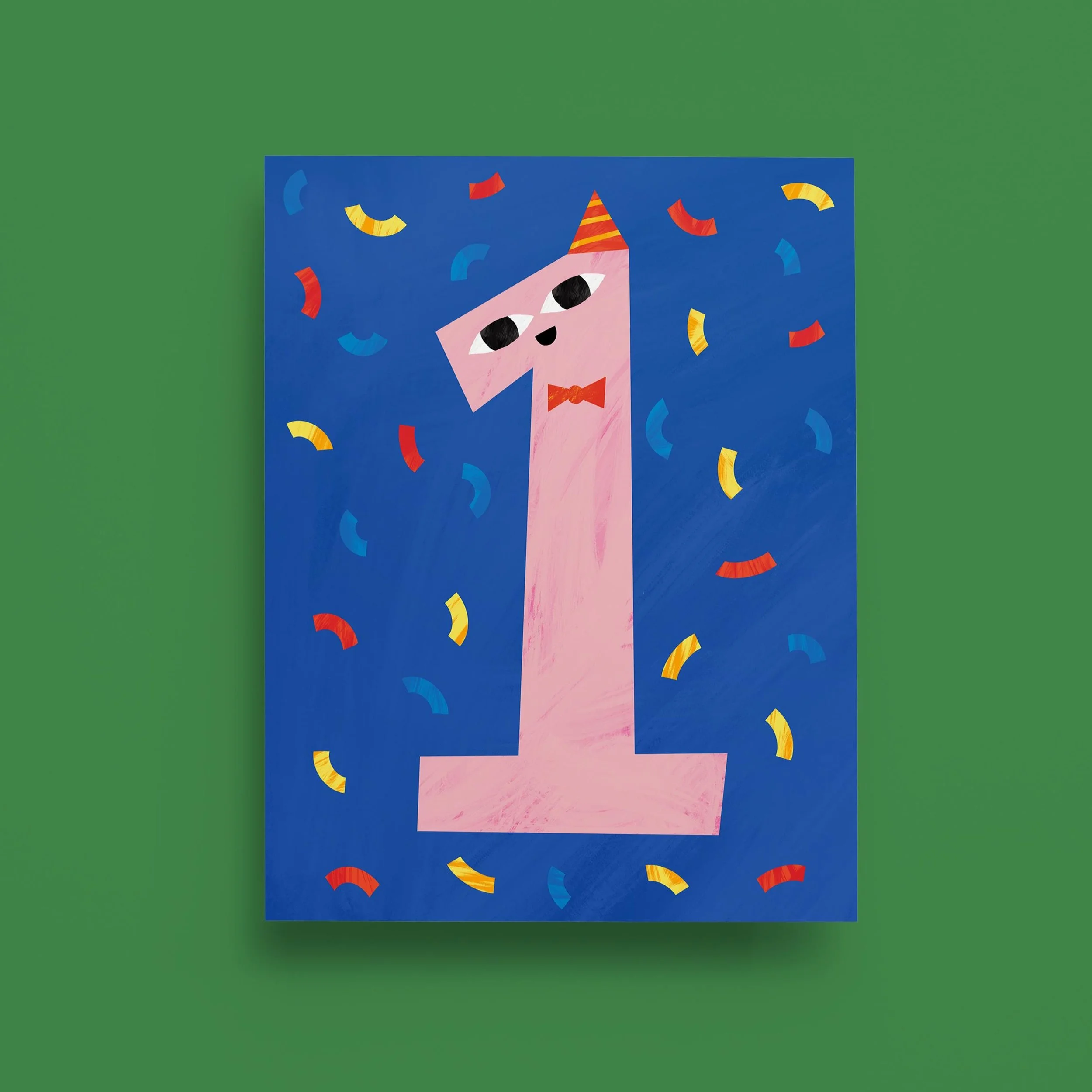 This whimsical first birthday card features a giant number one with eyes and a party hat — because even numbers deserve to party. Perfect for parents with a sense of humor or anyone who loves a touch of weird with their cute.