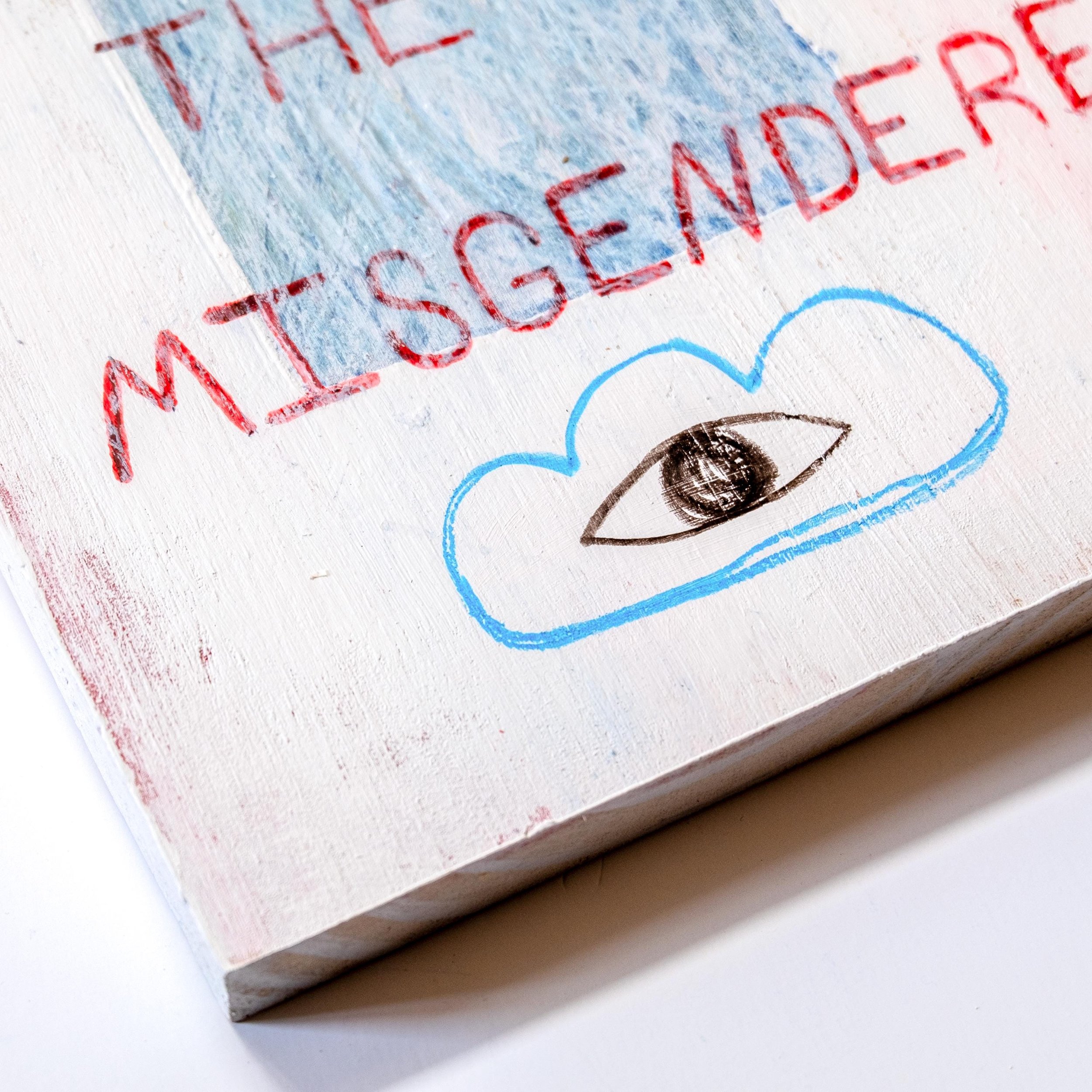 This is a mixed media artwork on a wood panel, created through a layered process of painting, washing in the sink, and rebuilding the surface. The background shifts softly between visible layers, suggesting what remains and what fades when navigating identity in a world defined by binaries.